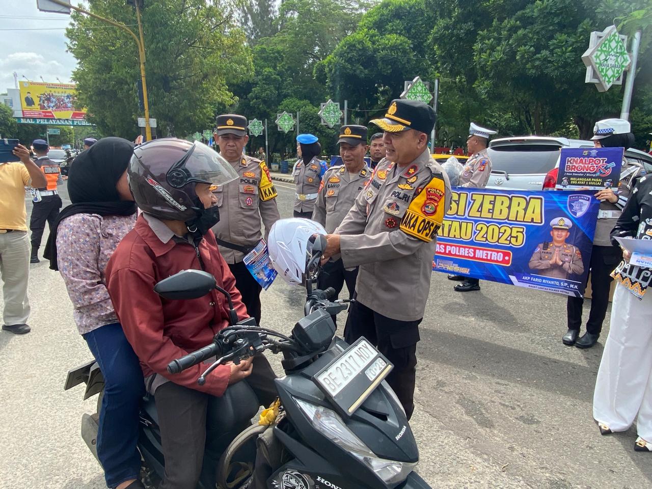 Polres Metro menggelar Operasi Zebra Krakatau 2025 di kawasan Traffic Light (TL) Masjid Taqwa Kota Metro, Jumat pagi Kegiatan ini tidak hanya berfokus pada disiplin berlalu lintas, tetapi juga mengedepankan pendekatan humanis melalui pembagian paket sembako beras, helm, pamflet, dan stiker keselamatan bagi para pengendara yang melintas.