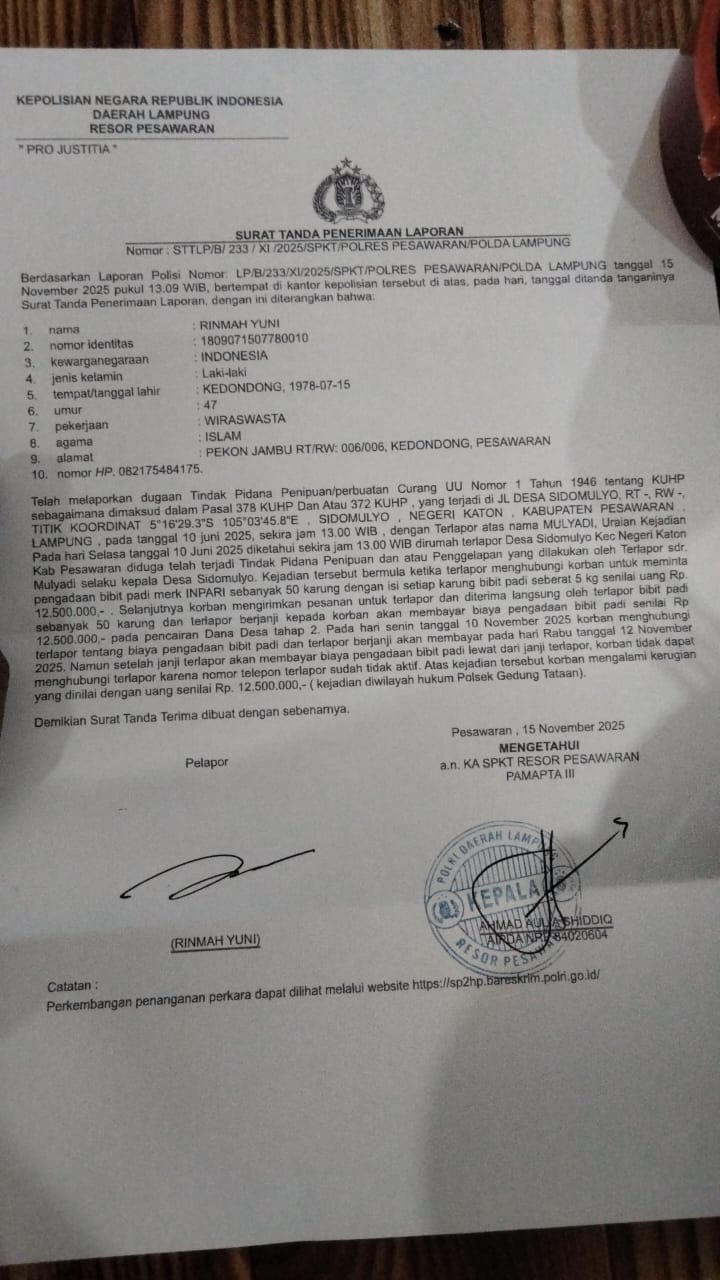 Merasa tidak ada itikad baik, Rinmah akhirnya melaporkan dugaan penggelapan tersebut ke Polres Pesawaran. Laporannya diterima dengan nomor STPLP/B/233/XI/2025/SPKT/Polres Pesawaran/Polda Lampung.