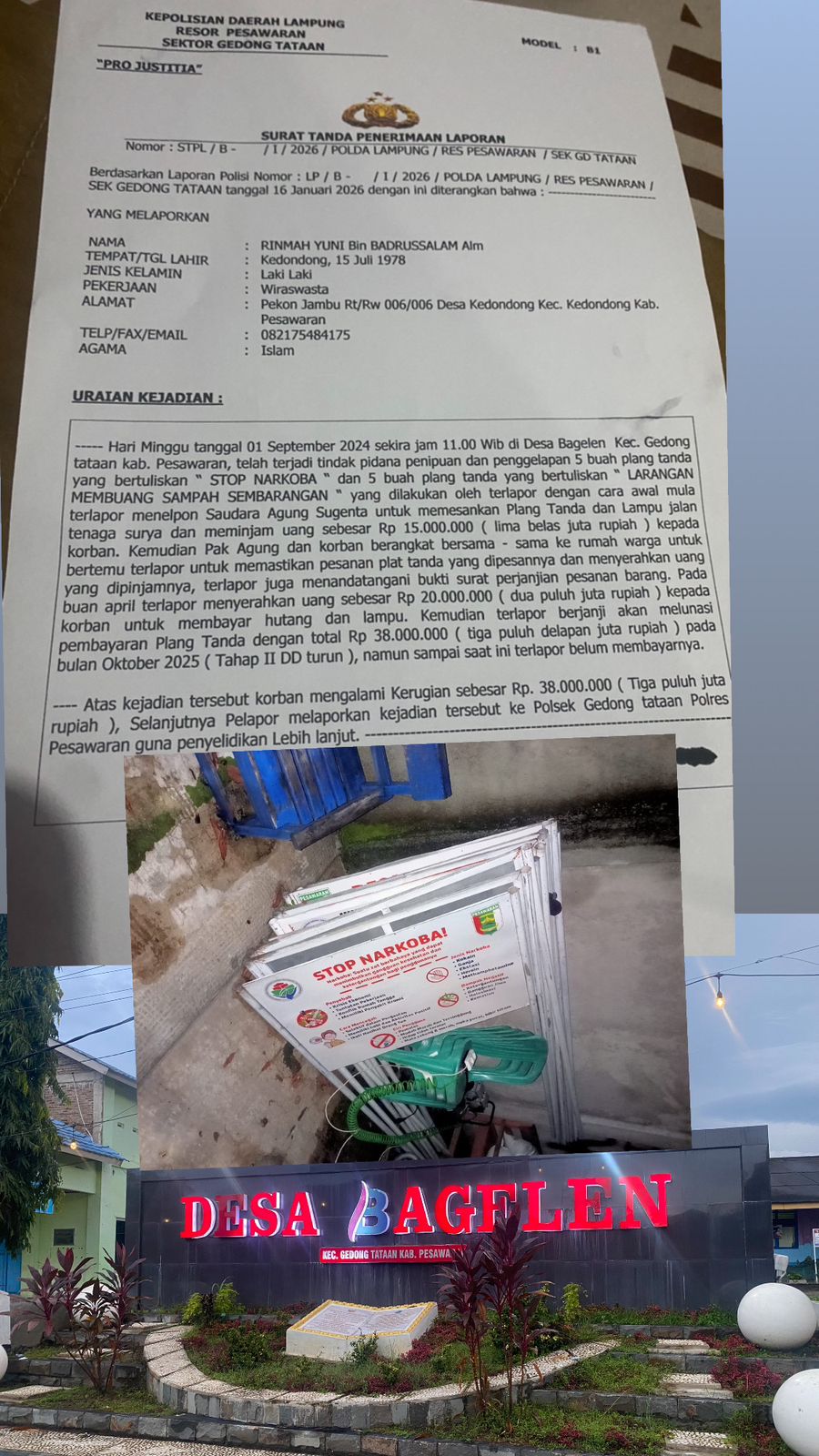 Kepala Desa Bagelen Kecamatan Gedong Tataan Kabupaten Pesawaran Merdi Parmanto S,Kom jum’at (16/1) resmi di laporkan oleh Rinmah Yuni warga Desa Kedondong Kecamatan Kedondong Kabupaten Pesawaran penyebabnya sang kepala desa di duga telah melakukan penipuan dan penggelapan dengan tidak membayar 10 buah plang yang beberapa waktu telah di pesan dan dikirim ,barang pesanan tersebut sesuai kesepakatan akan di bayar saat pencairan dana desa tahap 1 tahun 2025 silam .