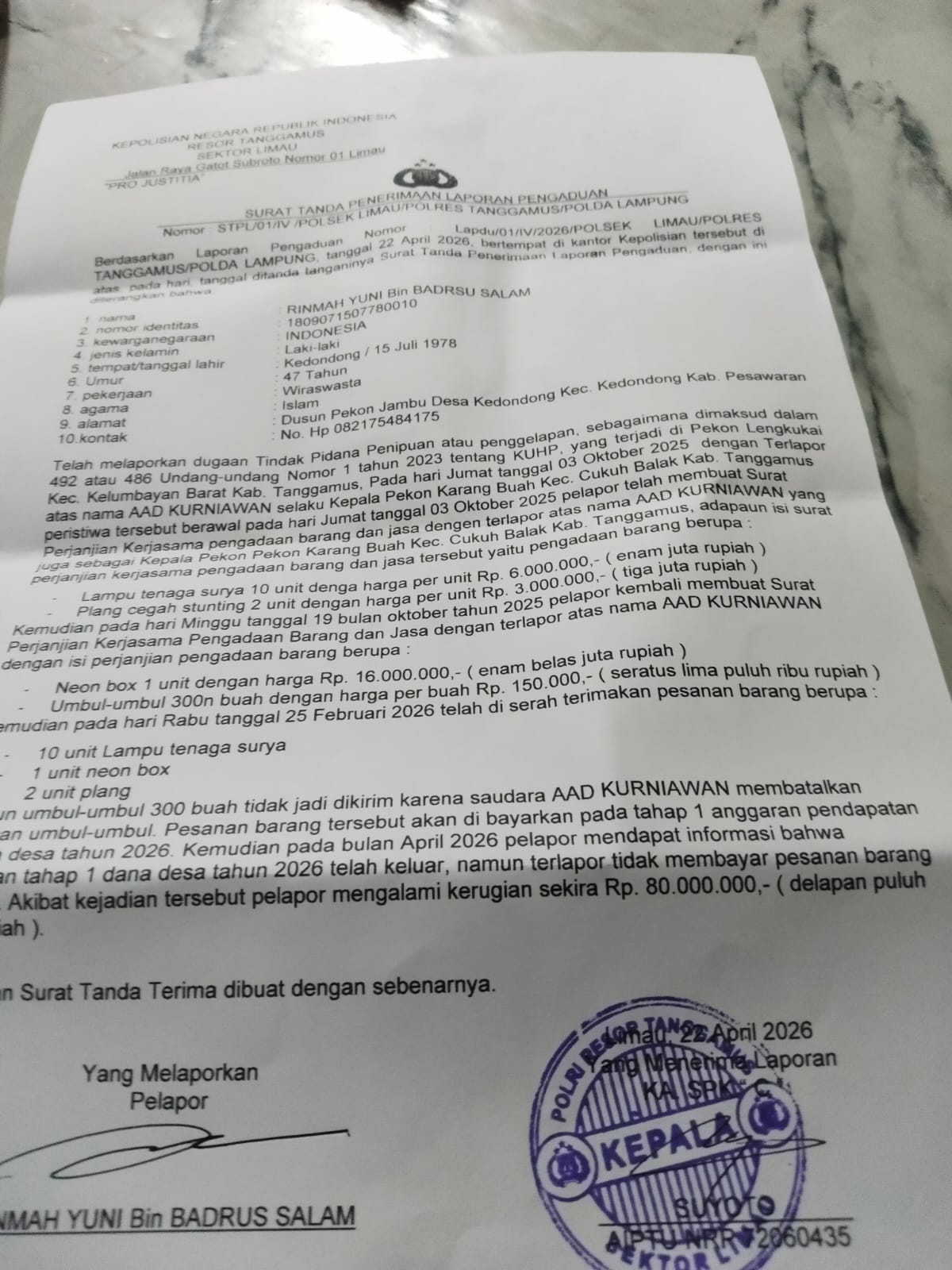Tanggamus – Kepala Pekon Karang Buah, Kecamatan Cukuh Balak, Kabupaten Tanggamus, Aad Kurniawan, kembali dilaporkan ke pihak kepolisian atas dugaan tindak pidana penipuan dan penggelapan terkait pengadaan barang senilai Rp80 juta.