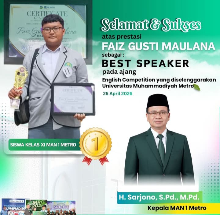 Penghargaan Best Speaker tersebut diberikan kepada Faiz Gusti Maulana setelah berhasil menunjukkan kemampuan berbahasa Inggris yang unggul dalam rangkaian kompetisi yang kompetitif dan menantang. Dalam sertifikat penghargaan yang diterima, Faiz dinobatkan sebagai “The Best Speaker” pada ajang ASES Championship 2026 dengan tema “Ignite: Where Words, Art, and Victory Meet.” Capaian ini menjadi bukti nyata kualitas akademik dan keterampilan berbahasa asing siswa MAN 1 Metro di tingkat provinsi.