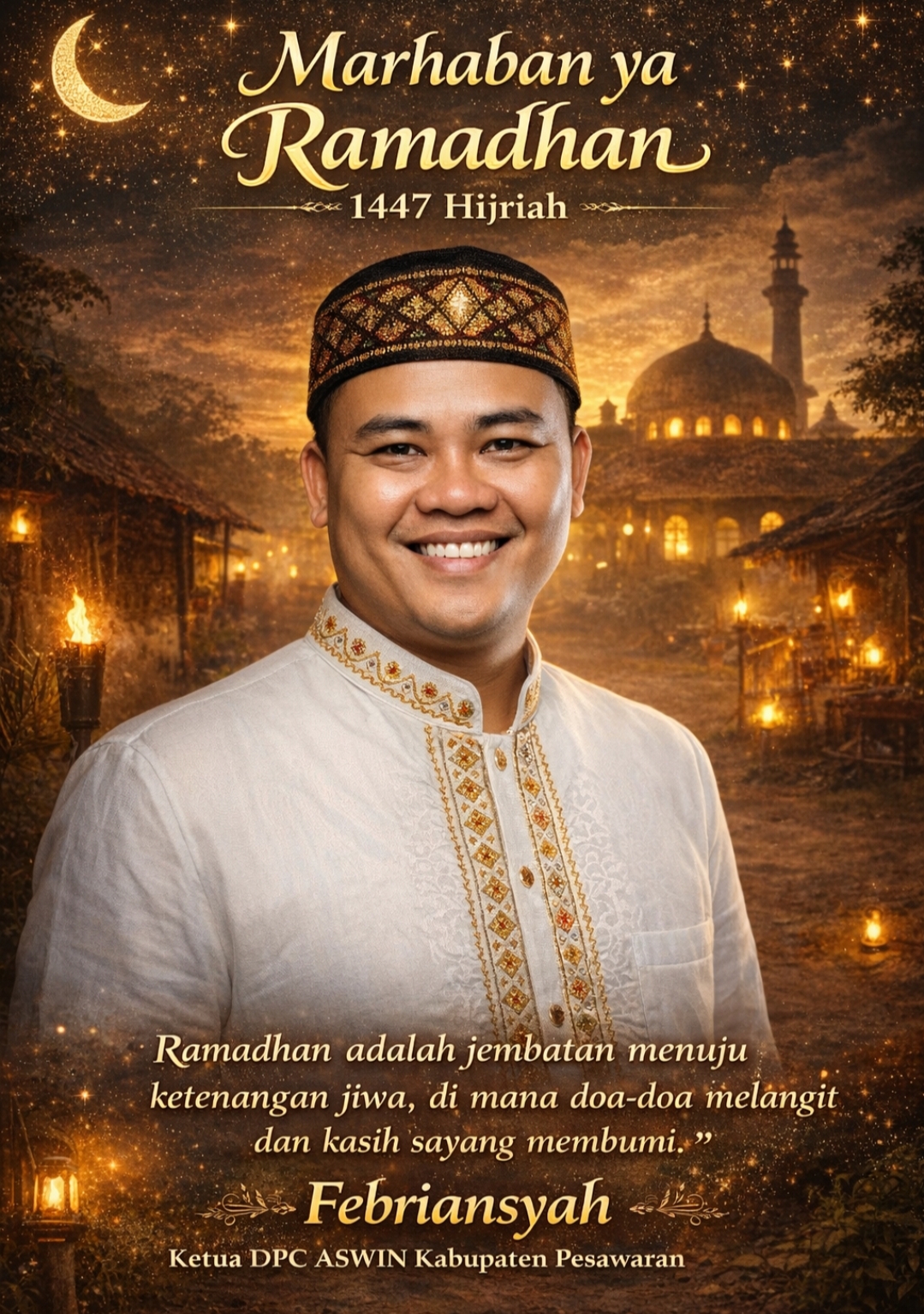Pesawaran – Dalam rangka menyambut dan menjalankan ibadah puasa Ramadan 1447 Hijriah, Ketua DPC ASWIN Kabupaten Pesawaran, Febriansyah, menyampaikan ucapan selamat kepada seluruh umat Muslim yang telah dan sedang menjalankan ibadah puasa.