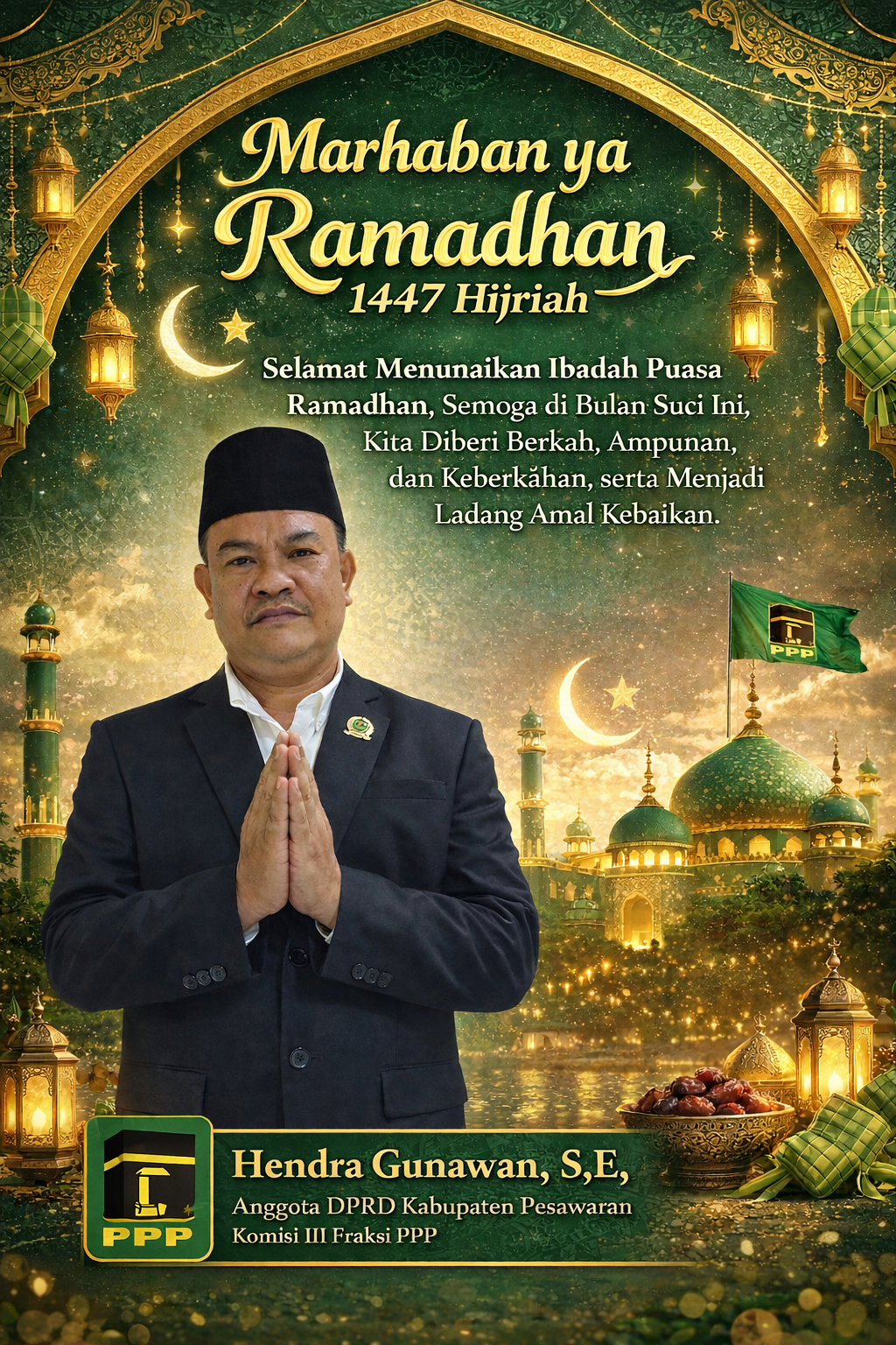 Pesawaran – Menyambut datangnya bulan suci Ramadhan 1447 Hijriah, Hendra Gunawan, S.E., Anggota DPRD Kabupaten Pesawaran Komisi III Fraksi PPP, menyampaikan ucapan Marhaban ya Ramadhan kepada seluruh masyarakat, khususnya umat Islam di Kabupaten Pesawaran.
